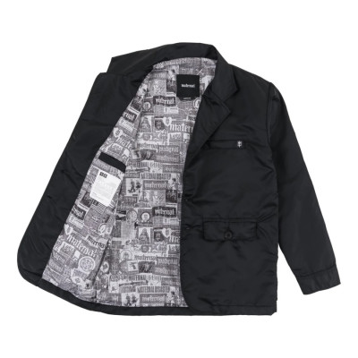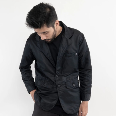 Black high density polyester collar jacket / coat with black plastic buttons and satin label.