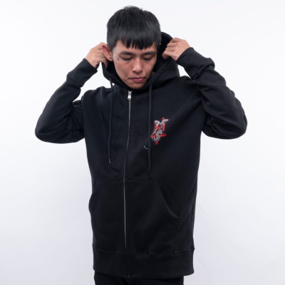 Black cotton fleece 280 gsm zip-up hoodie, red and white plastisol ink screen print, silver chrome color zipper.
