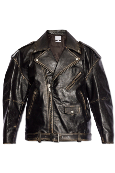 Black biker jacket from HALFBOY. Made from leather with a relaxed fit, this style fastens via a zip and features a vintage effect, shoulder epaulettes, three zip pockets and one flapped pocket with a snap on the front, long sleeves with zip cuffs and a buckle adjuster at the waist.