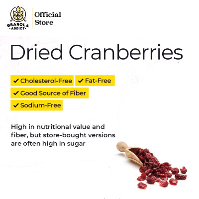 MIX DRIED FRUIT - 250G PIRT No. 2153671020417-26 Komposisi: - Dried Cranberry 50% - Dried Seedless Raisin 50% Manfaat kismis & cranberry : 1. Baik untuk Kesehatan Jantung Kismis terdiri dari flavonoid dalam jumlah besar sehingga kismis merupakan sumber nutrisi terbaik untuk mendorong kesehatan jantung. Cranberry kaya akan senyawa polifenol dan vitamin C yang baik untuk mencegah pertumbuhan tumor dan kanker dalam tubuh, serta mencegah penyakit jantung.. 2. Melawan Kanker Anti-oksidan yang melimpah menjadikan kismis sangat efektif untuk memerangi kanker. 3. Kesehatan Pencernaan 4. Memperlambat Proses Penuaan 5. Mencegah Peradangan 6. Jika Anda menderita obesitas, konsumsilah jus cranberry secara rutin. Sebab buah ini kaya akan asam organik yang dapat mengurangi timbunan lemak di dalam tubuh Anda. Cara Konsumsi : Dapat dimakan langsung, dicampur ke adonan kue / cookies, dicampur oatmeal, granola, smoothie dll.