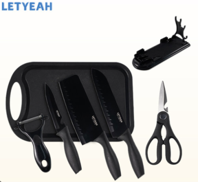 Daftar kemasan: pisau dapur * 1, pisau koki * 1, pisau buah * 1, gunting * 1, pengupas * 1, talenan * 1, tempat pisau * 1