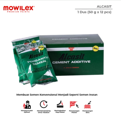 MOWILEX ALCASIT (ADDITIVE/BAHAN PEMBANTU SEMEN) bahan tambahan yang dapat membuat semen konvensional menjadi seperti semen instan. Memperpanjang waktu pengadukan sehingga menambah kekuatan dan meningkatkan daya rekat, semen menjadi lebih mudah diaduk dan lebih lentur sehingga minim retak rambut. Detail produk • Produk dijual per sachet • 1 dus = 12 sachet • Mudah digunakan • Tahan air • Membuat pengadukan semen menjadi lebih mudah PENGGUNAAN - Pemasangan batu bata dan batako dalam pembuatan tembok. Rekomendasi pemakaian : 0,1 – 0,2 % MOWILEX ALCASIT terhadap semen. - Plesteran dan acian semen Rekomendasi pemakaian : 0,1 – 0,3 % MOWILEX ALCASIT terhadap semen. - Adukan gypsum untuk profil dan compound Rekomendasi pemakaian : 0,1 – 0,5 % MOWILEX ALCASIT terhadap gypsum powder. - Adukan pelekat pemasangan keramik Rekomendasi pemakaian : 0,1 – 0,5 % MOWILEX ALCASIT terhadap semen.