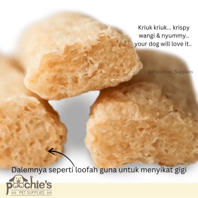 Himalayan Dog Chew® Happy Teeth Daily Dentals are Gentle on Dental®. Happy Teeth® is an innovative chew that supports oral health and wellness for dogs. These once-a-day chews have a loofah-like texture made to scrub teeth and gums while helping reduce tartar and plaque buildup. The crunchy texture helps remove plaque and tartar during the natural chewing process. With its delicious spinach flavor, your pup will have no idea they are cleaning their teeth during chew time! The perfect 30-day supply of dental treats for your dog and the comfort of your pet’s wellbeing. Ingredients: rice powder, Cheese, Coconut powder KEY BENEFITS: •Treat your dog once a day for oral health and wellness •Can reduce plaque and tartar buildup •Natural and easily digestible •No artificial flavors, preservatives, or binding agents isIt is important to choose a chew that matches your dog’s chewing rate, age and habits. Check out our Chewmeter to help you make the best choice for your dog. You can find the Chewmeter on the back of all our packaging and product pages. ADVICE FOR USE: •Give as a reward or treat! • Supervise pets when giving them any treat. • For dogs over 12 weeks old • Not for human consumption • Chews will last longer if kept in a cool and dry place (do not refrigerate) • Wash hands after handling products with dog drool • Remove treat if a potential hazard presents itself. isi : 30pcs 12oz (340g) karena bentuk nya puff jadi packingan nya lebih besar
