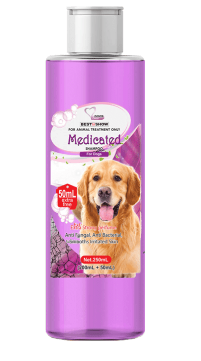 - Best In Show Medicated Shampoo merupakan shampo anti jamur dan bakteri untuk iritasi kulit anjing yang mampu membantu mengurangi gatal-gatal dan membersihkan serta merawat bulu anjing.