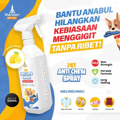 Pakai, RACOON Pet Anti Chew Spray untuk membantu mencegah hewan peliharaan untuk menggigit sendal, sepatu, sofa, furniture dll.