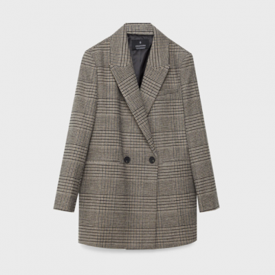 Blazer panjang dengan kerah lapel dan lengan panjang. Dilengkapi saku jetted depan palsu dan kancing model silang di depan.