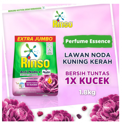 Rinso Molto Detergen Pertama Bunuh VIRUS! Kini hadir dengan formulasi 3X lebih efektif Angkat Noda dan bunuh 99.99% BAKTERI & VIRUS SARS-CoV 2. Hilangkan noda bandel hanya dengan 1X Kucek. Detergen bubuk Rinso BARU dilengkapi teknologi anti residu yang menjaga pakaian tetap cemerlang. Varian PERFUME ESSENCE memberikan keharuman mempesona Violet dan Raspberry yang tahan hingga 21 hari. Bahan pembersih terbuat DARI ALAM menjaga tangan tetap lembut & tidak panas. Anti Noda, Anti Bakteri & Virus, Anti Bau Apek dengan Rinso Detergen Bubuk. Tersedia juga dalam detergen cair dan telah tersertifikasi halal.