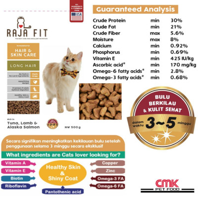 Raja Fit Hair & Skin Care - Long Hair adalah dry kibble cat food yang lengkap diformulasikan untuk memenuhi kebetuhan nutrisi untuk kucing disegala usia dengan kebutuhan untuk hair and skincare (long hair) Nutrisi lenkap yang seimbang diformulasikan khussu untuk kebutuhan dan kesehatan kulit dan bulu kucing yang panjang. Keunggulan: 1. Protein berkualitas tinggi. 2. Vitamin A dan Vitamin E 3. Vitamin B Group 4. Kandungan Mineral 5. Omega 3 dan 6 Fatty Acid