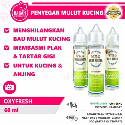 Larutan penyegar untuk dicampurkan ke air minum hewan untuk membantu mencegah dan memperlambat terjadinya karang gigi dan membantu mengatasi sariawan dan infeksi gusi pada hewan. Bahan ekslusif Oxygene® ( Stabilized Chlorine Dioxide ) menetralisir gas gas asam yang berasal dari karang gigi hewan dan menghilangkan baunya dalam sekejab.