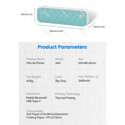 PERIPAGE Printer A4 203 Dpi Mini Printer Resi Thermal Bluetooth