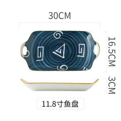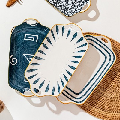 ASHOME Piring Saji dan Lauk Keramik persegi panjang gagang Motif Jepang Tahan Panas dan Microwave Safe / Piring Saji Keramik Jepang / Handle Fish Plate Jepang / Piring Lauk Jepang dengan gagang / Piring Lauk Aestetik / Piring Jepang
