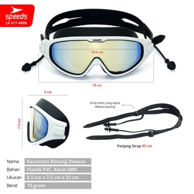 Kacamata Renang Speeds membuat anda nyaman dalam berenang dan nyaman sehingga membuat mata tidak iritasi walaupun renang berjam-jam. Dengan di lengkapi earplug dan karet super empuk dan nyaman sehingga tidak meninggalkan bekas di wajah anda. Kacamata renang speeds ini cocok untuk anda yang baru belajar renang ataupun anda yang sudah profesional.