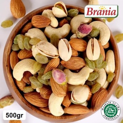 Berat Bruto 600g Berat Bersih 500g - Kami buka hari Senin - Sabtu. - Pesanan yang telah kami proses tidak dapat dibatalkan. - Order yang dibayarkan sebelum jam 14.00 akan dikirimkan di hari yang sama. - Pesanan yang masuk pada hari Sabtu diatas pukul 14.00WIB akan dikirimkan pada hari Senin. - Pengiriman tutup Minggu (hanya menerima order, order dikirim pada hari Senin) Nomor Sertifikat Halal MUI LPPOM-00100138310122 Premium Mixed Nuts : Roasted Almond Roasted Cashew Honey Cashew Lightly Salted Pistachio Snack ini merupakan gabungan dari 4 macam kacang premium yang sangat bernutrisi, enak, dan sehat. - Almond terkenal kaya akan kandungan vitamin E, vitamin B, serat, mineral, dan asam lemak esensial. - Cashew kaya akan serat, vitamin, kalium, folat, vitamin E, dan vitamin B6. - Pistachio mengandung lemak sehat, protein, serat, kalsium, zat besi, seng, magnesium, dan berbagai jenis vitamin. Berbagai manfaat ini Anda dapatkan dalam Premium Mix Nuts Brania. Berat Bersih 500g Tersedia juga dalam kemasan 250g