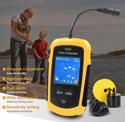 Fish Finder atau Pelacak ikan dari pabrikan Lucky, yang adalah spesialis manufaktur untuk alat pelacak ikan. Selain tipe ini, kami juga menjual tipe lain dari pabrikan Lucky dan manufaktur lainnya. Wired dan Wireless ==== Features: - Get the approximate location of fish and the depth of water. - Display the nature or circumstance of bottom of Sea (i.e. grass, rock and sand). - Round transducer sensor with 7.5 m cable, 45-degree beam angle. - With fish depth scale and audible fish alarm. - User selectable meter or feet readings. - Range of depth readout up to 100 meters. - Removable float Specification: Display : TN/ANTI-UV LCD Backlighting: green LED Powered by : 4 x AAA batteries (NOT included) Measurement units: Feet and meters Depth range :100m Sensor Beam Angle :45 degrees Operating temperature : -20 Celsius to 70 Celsius (-4 Fahrenheit to 158 Fahrenheit)
