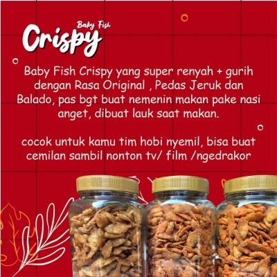 Baby fish / ikan nila 200gram all varian rasa : orginal, balado, pedes ▪︎kripsy ▪︎gurih ▪︎ renyah, enak buat tambahan makan pake nasi ▪︎ kemasan toples gampang dibawa kemana" dan sangat enak buat cemilan ▪︎100% halal ▪︎Higenis ▪︎masa penyimpanan 1bulan tutup rapat bisa sampai 2bulan ▪︎Ikan di produksi setiap hari nya jadi bukan stok lama stok baru terus yaa di jamin renyah, kita suplai ke warung makan pastinya stok terbaru terus soal perputaranya cepat Isi 200gr ( BERAT SESUAI SOP BERLAKU 200GRAM ) Isi dari ikan ga full atau full toples tergantung dari ikannya gede atau kecil nya ikan